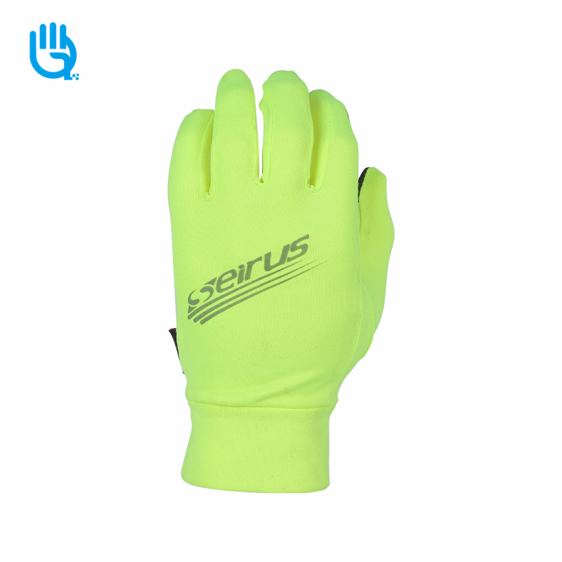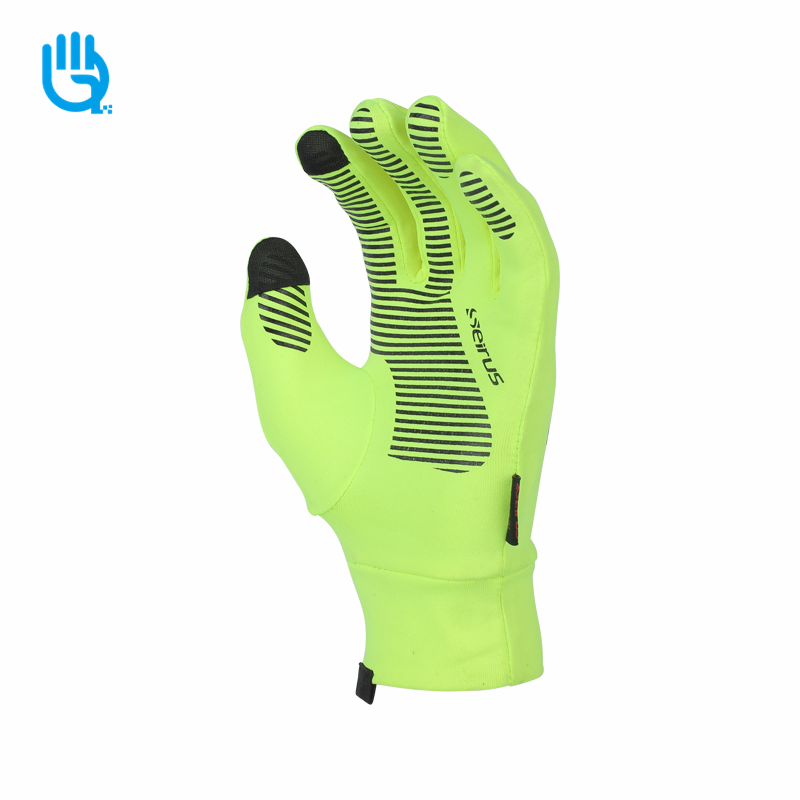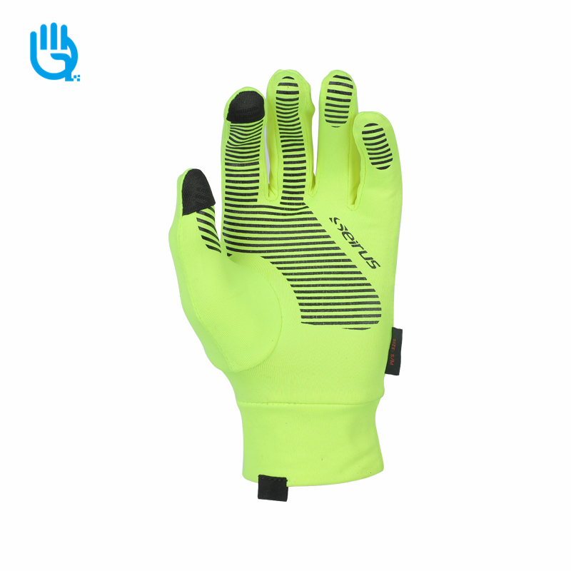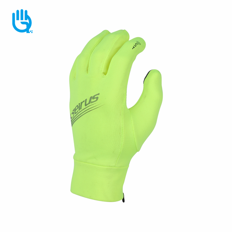 掌部荧光弹力拉毛布,材质柔软及提升手套佩戴舒适性,上面印硅胶,增加手部的抓握和防滑特性;手背荧光弹力拉毛布,上面印反光,方便夜间使用及为手背提供保护;食指大拇指加导电针织布,方便手机接听电话及电子产品的使用,手指湾指形状,按照人体工程学进行裁片缝制,提供手套良好手型和轻盈紧肤的舒适穿戴;拉毛弹力布袖口,更好的适用关节收缩尺寸及手关节的保护。